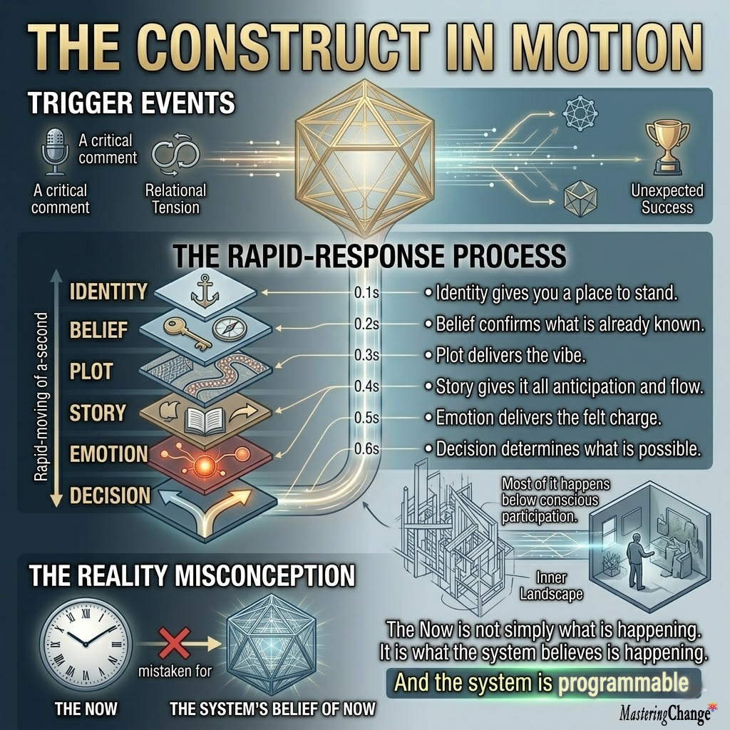 Meaning made in the past shapes perception in the present. The construct generates experience from the inside. It organizes what stands out, what feels threatening, what feels familiar, what feels charged, and what story seems self-evidently true.