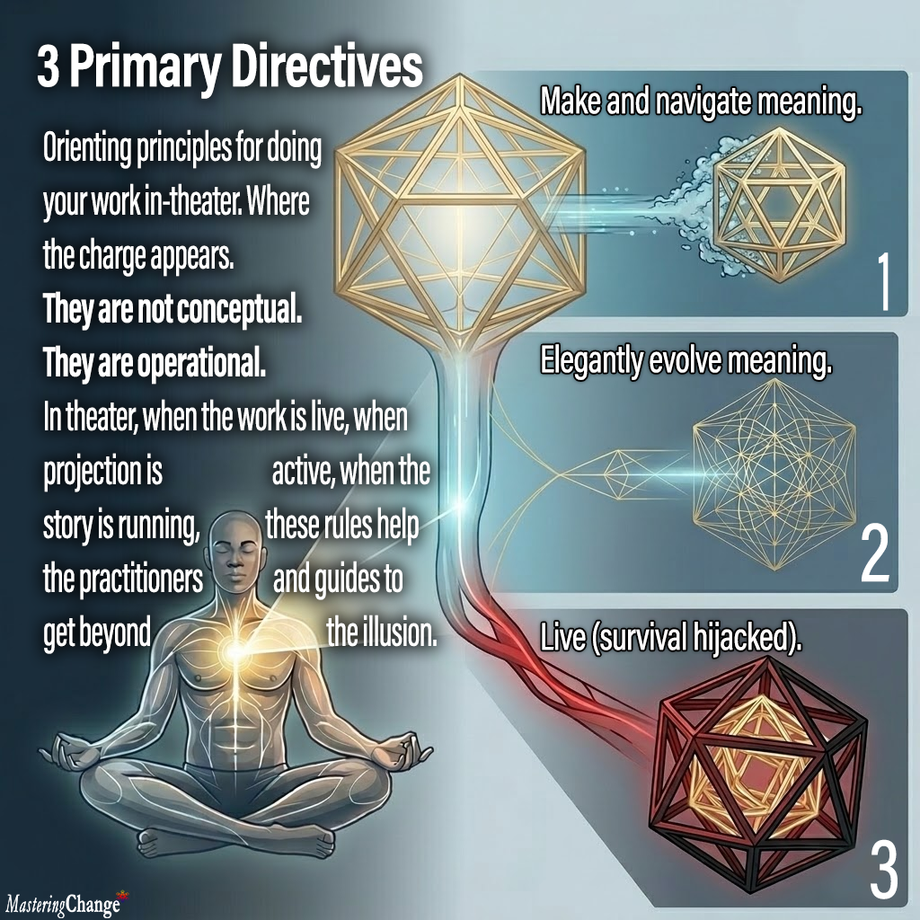 In theater, when the work is live, when projection is active, when the story is running, these rules help the practitioner and guide get beneath the illusion.