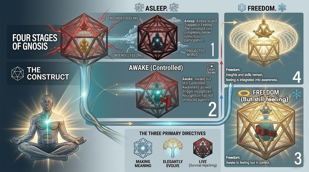 Gnosis is direct knowing. Not conceptual understanding but the embodied recognition of what is actually running in the construct. The practice maps the arc from capture to freedom in four stages.